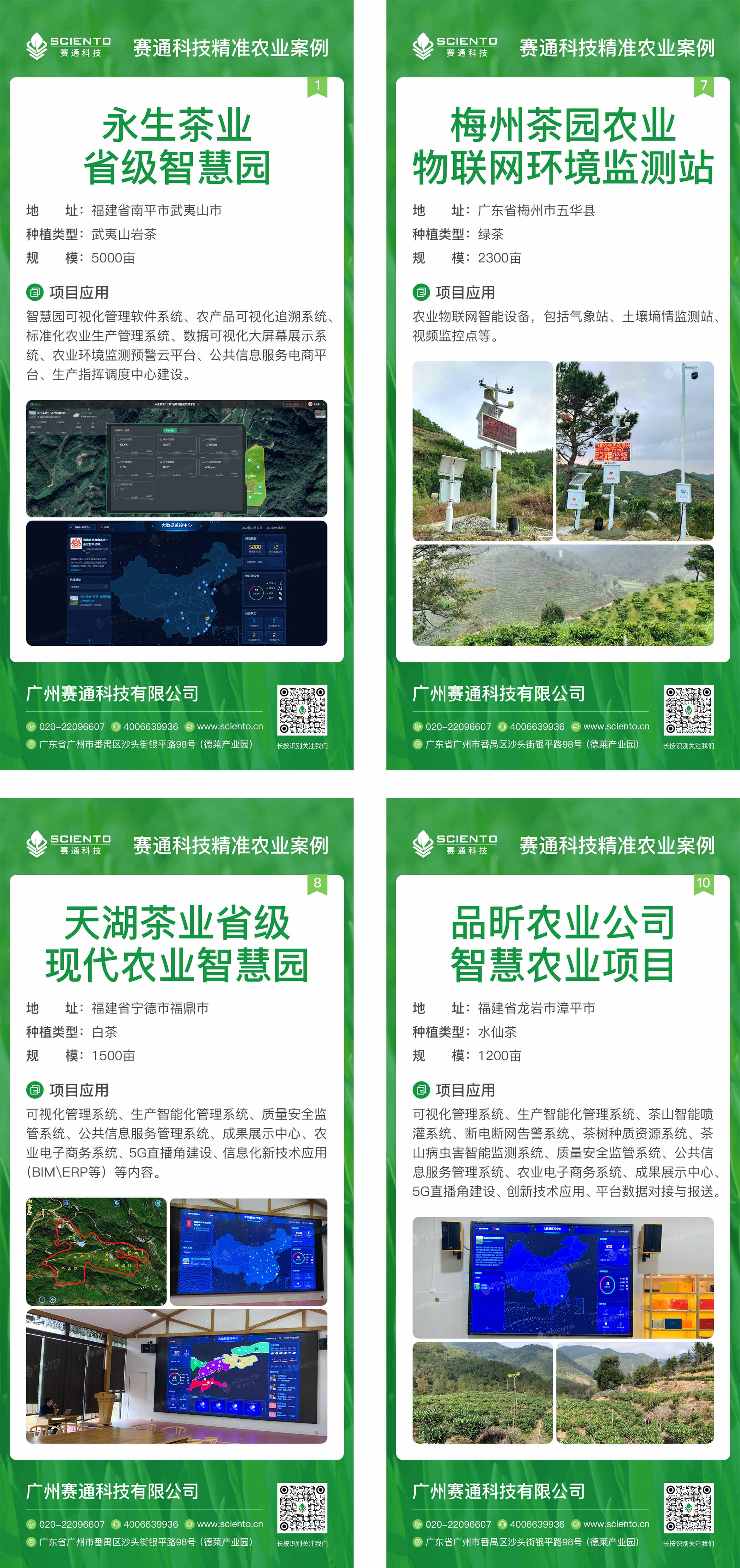 赛通科技目前已为福建永生茶业、福建天湖茶业、福建品昕农业、梅州茶园等多个项目提供智慧茶园系统解决方案,服务面积超10000亩,通过重构茶园生态系统和管养模式,实现精准种植、智能管控。
