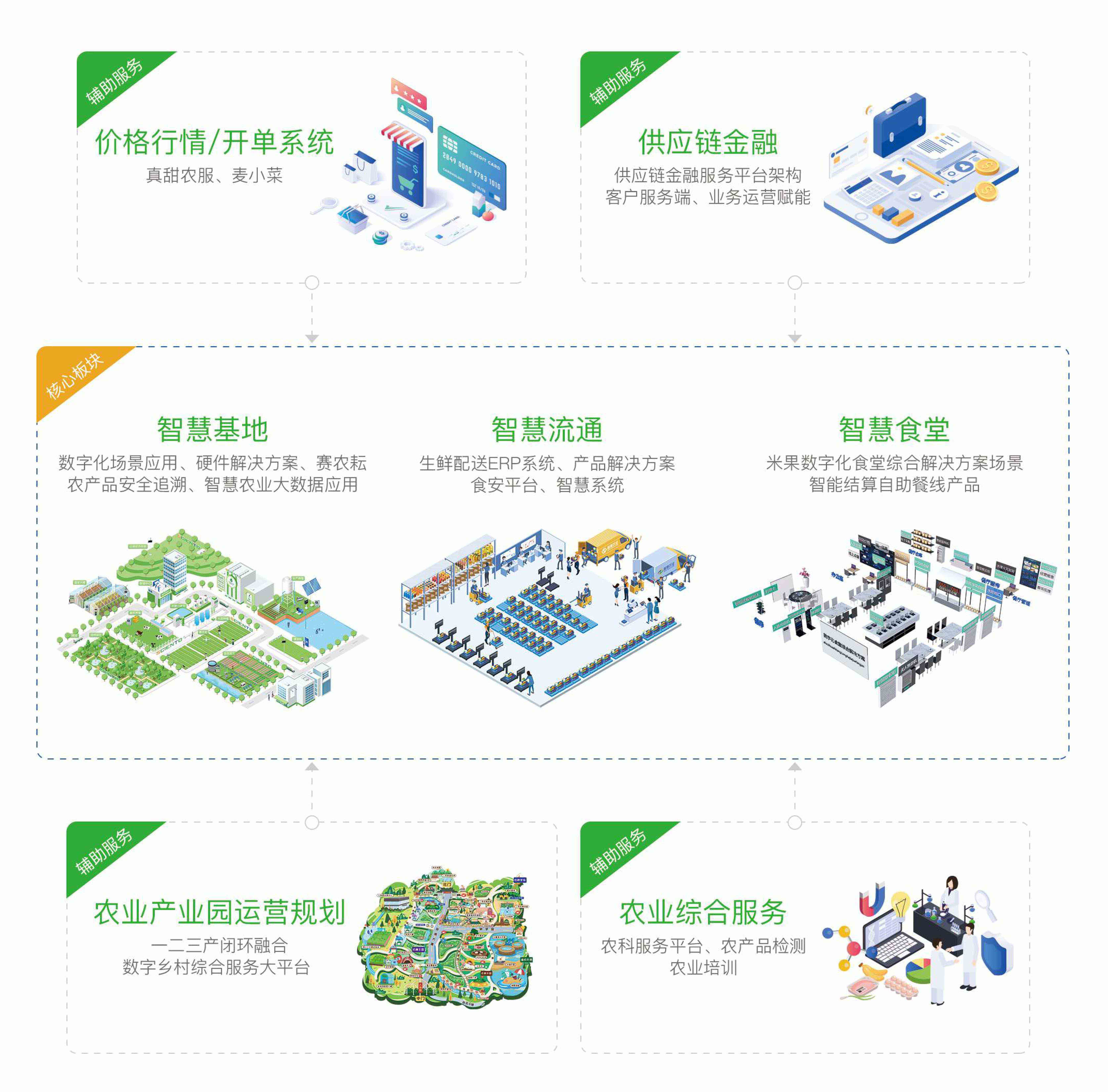 智慧农业成立于2015年,以“致力于中国农业产业链数字化升级”为使命,围绕农业产业链发展,结合IoT、互联网、大数据以及人工智能等科技,领航旗下广州赛通科技有限公司、广州米果智能设备有限公司、广州智慧真甜科技有限公司、广州晨诺农业科技有限公司及广东乐禾农业科技有限公司等子公司,提供数字农业、生鲜流通、智慧食堂解决方案及价格行情、现代农业产业园运营规划、农产品检测、供应链金融、综合农科等服务。