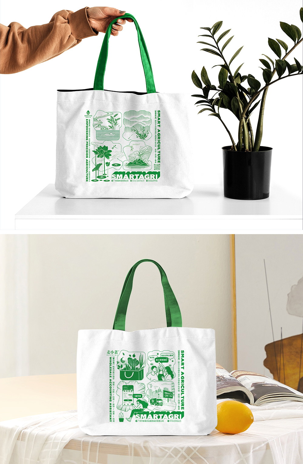 以麦穗、花卉、水产、茶山等场景融入“智慧农业”,以蔬果批发、批发难题、产品功能和流通保障等元素融入“智慧流通”,将两大业态结合智慧农业公司使命、产业链等要素进行企业文创周边的创意设计,借助帆布袋为载体,将产品宣传深入日常场景,让客户在使用过程中不断加深印象,提升对智慧农业和智慧流通业务的认知度和品牌感知度。
