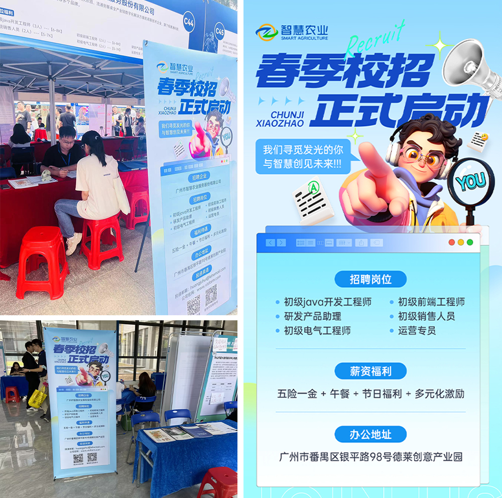 自智慧农业启动校招以来,我们先后走进华南师范大学、广东财经大学等多所知名院校展开校招工作,现场引起各类专业学科的学子们围观咨询。