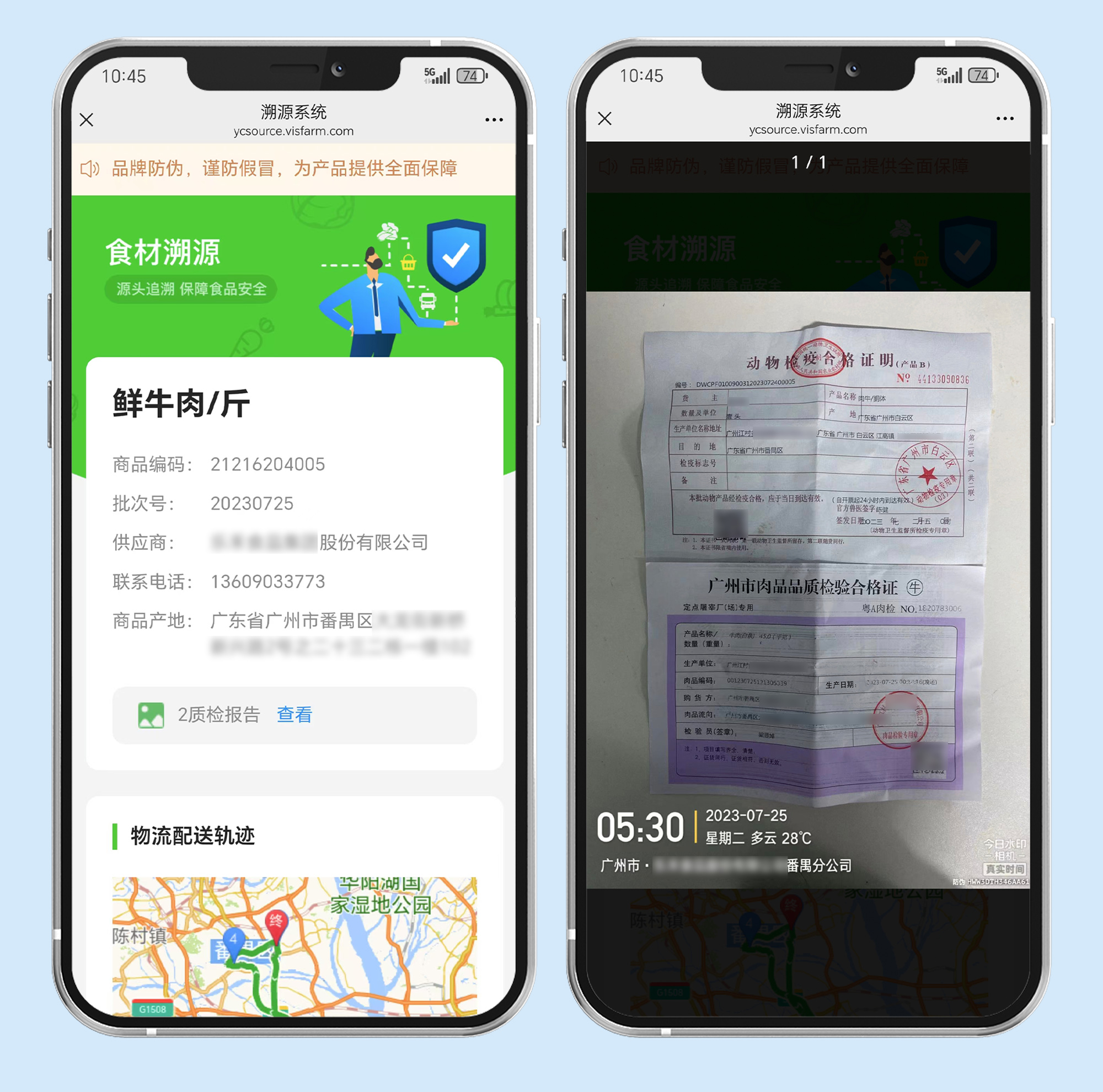 食材自检后自动上传数据,实现一品一码追溯,客户扫码即可从源头追溯商品来源与检测报告,确保食材安全。
