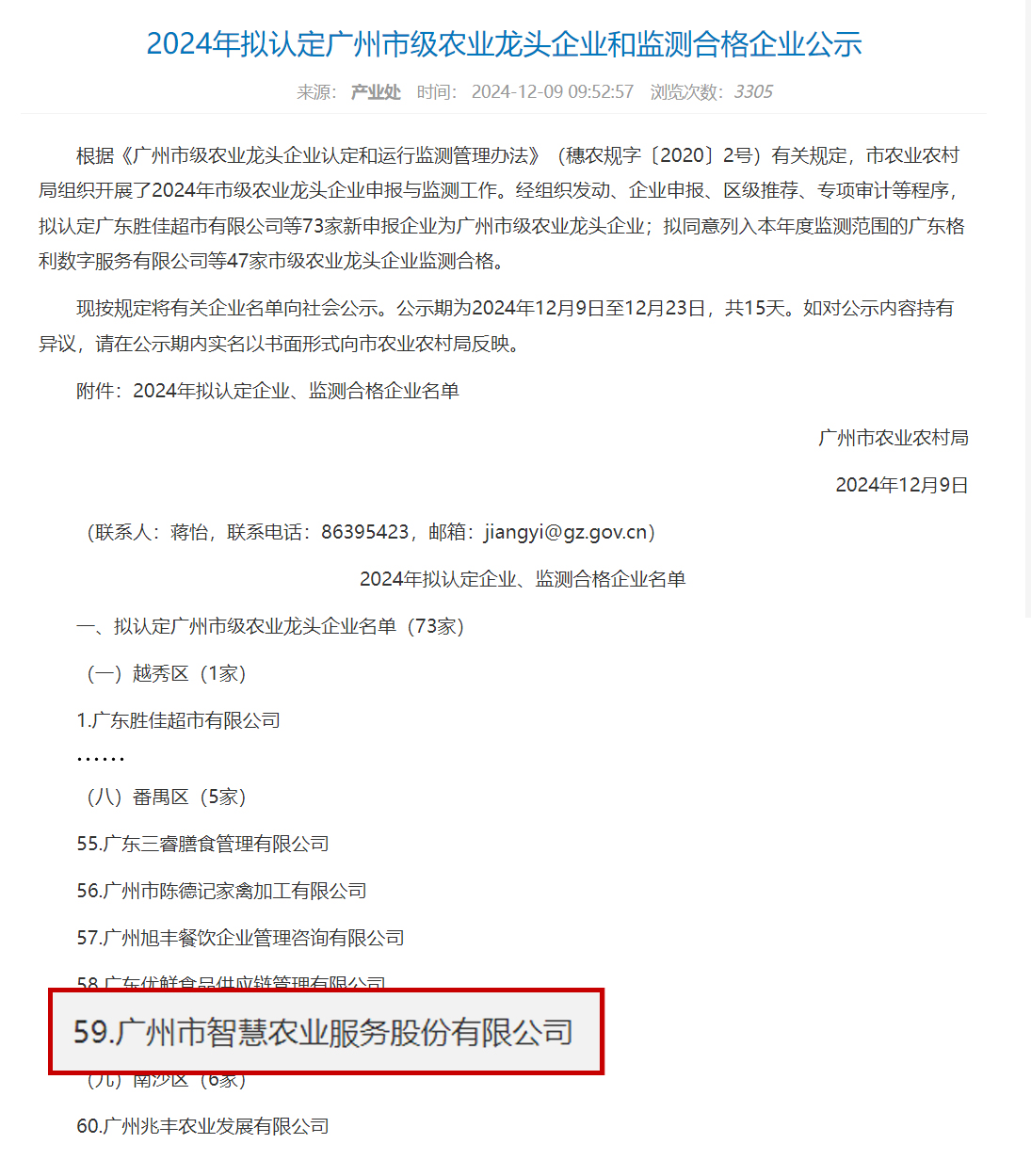 喜报!广州市智慧农业服务股份有限公司获评“广州市级农业龙头企业”