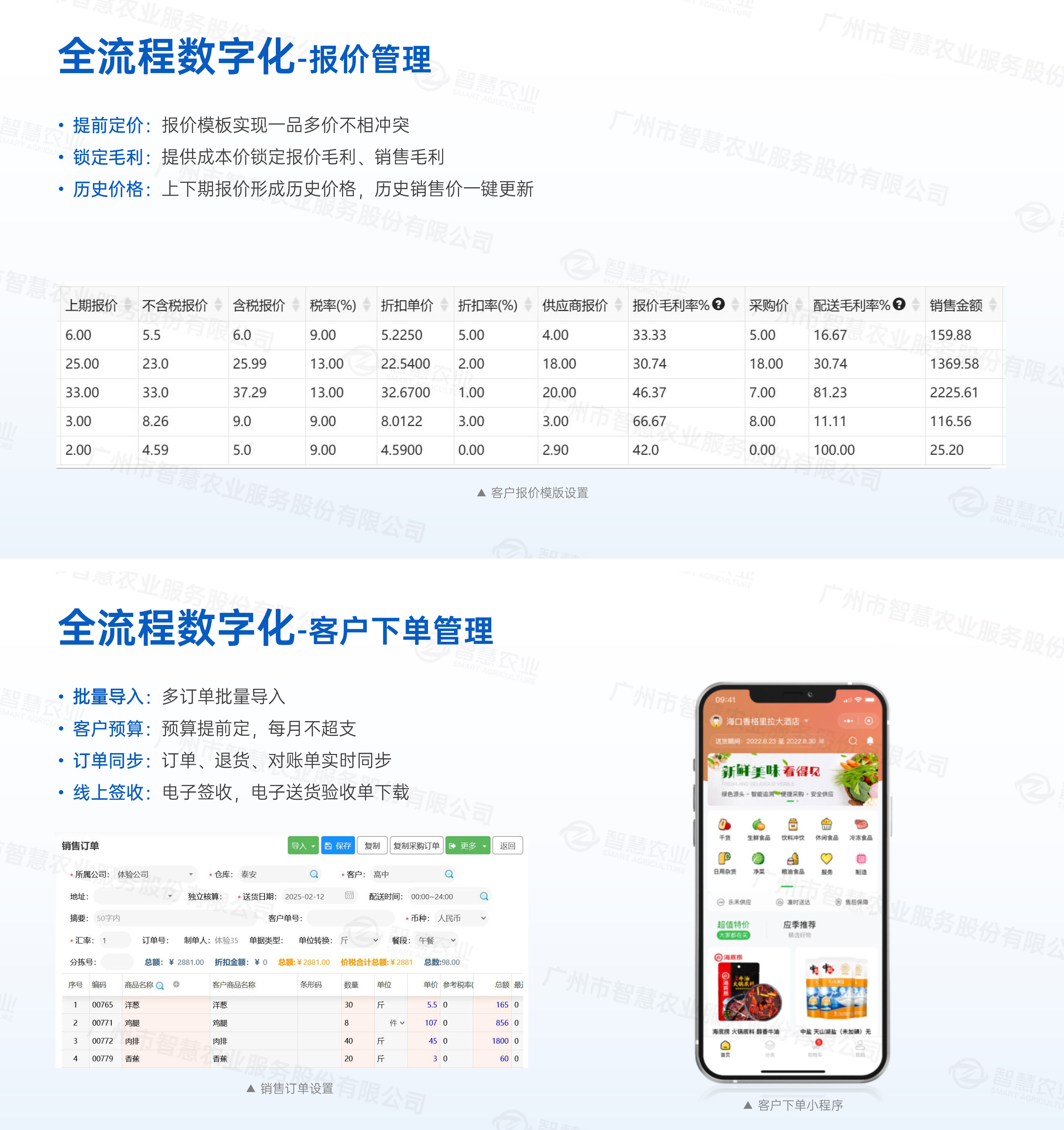 广州市智慧农业服务股份有限公司基于多年食材配送行业深耕经验,自主研发『智慧农业食材配送全流程数字化系统』,通过物联网、大数据和AI技术,将分散的食材供应链各环节整合为协同网络,为生鲜配送企业提供从采购、库存管理到订单处理、分拣配送以及财务管理的全流程覆盖,帮助企业实现从内部管理到外部协同的端到端数字化升级。