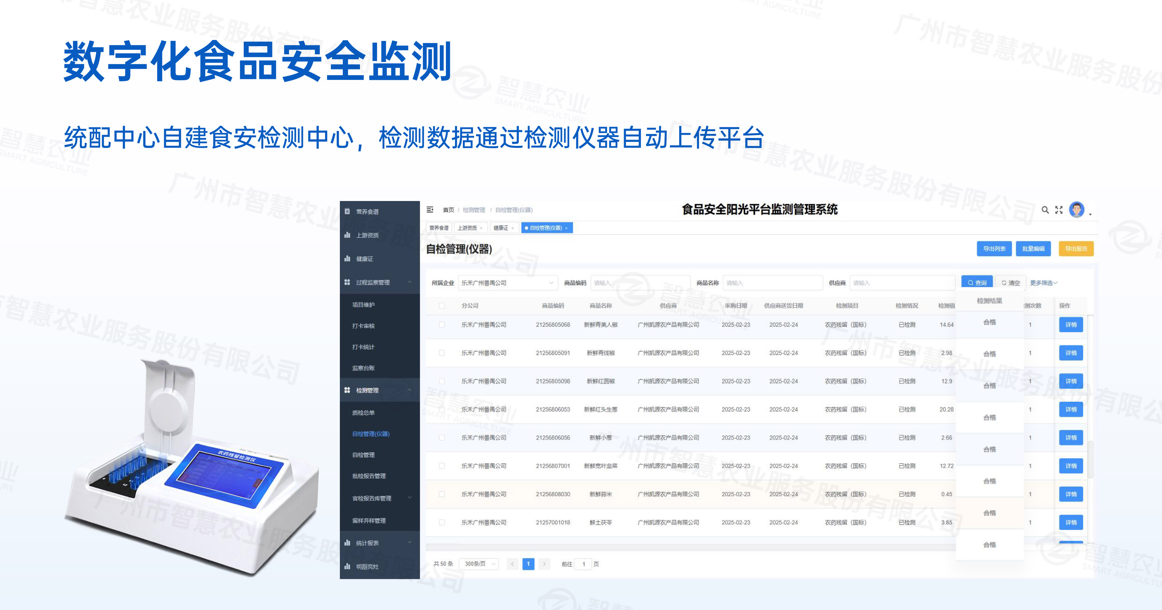 同时,响应国家食品安全要求,向食材配送企业提供食品安全监管系统,借助食安检测仪器及食安监控大屏,实时采集公示关键指标数据和配送过程,从供应商源头到终端配送环节实现无缝追踪。