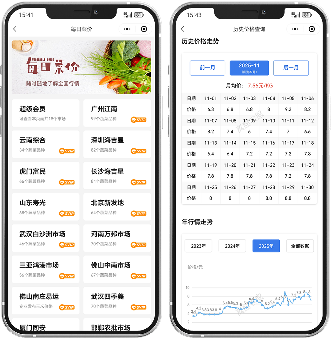 行情决策中枢:菜价服务覆盖全国18个一级农批市场,包含广州江南、深圳海吉星、北京新发地等核心市场,提供14个一级农批市场超1000个蔬菜品种的历史菜价,以及近200个单品的各地菜价对比数据,种植户、采购商都可通过小程序追溯价格波动、历史价格走势和年行情走势,科学规划种植周期与销售策略。